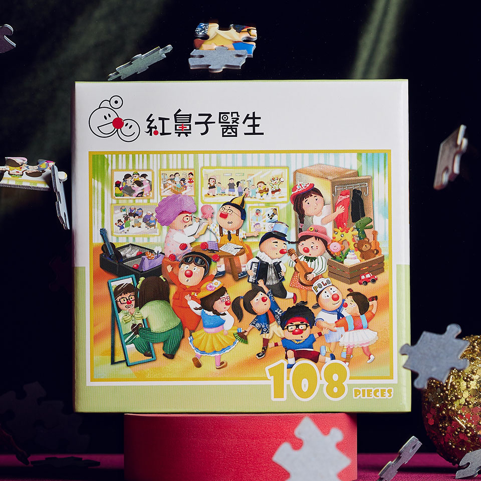 拼圖中的場景,象徵每場演出開始前的準備過程。有人化妝、有人練習、有人對鏡子微笑,讓我們拼出紅鼻子醫生「魔法」發生前的日常。