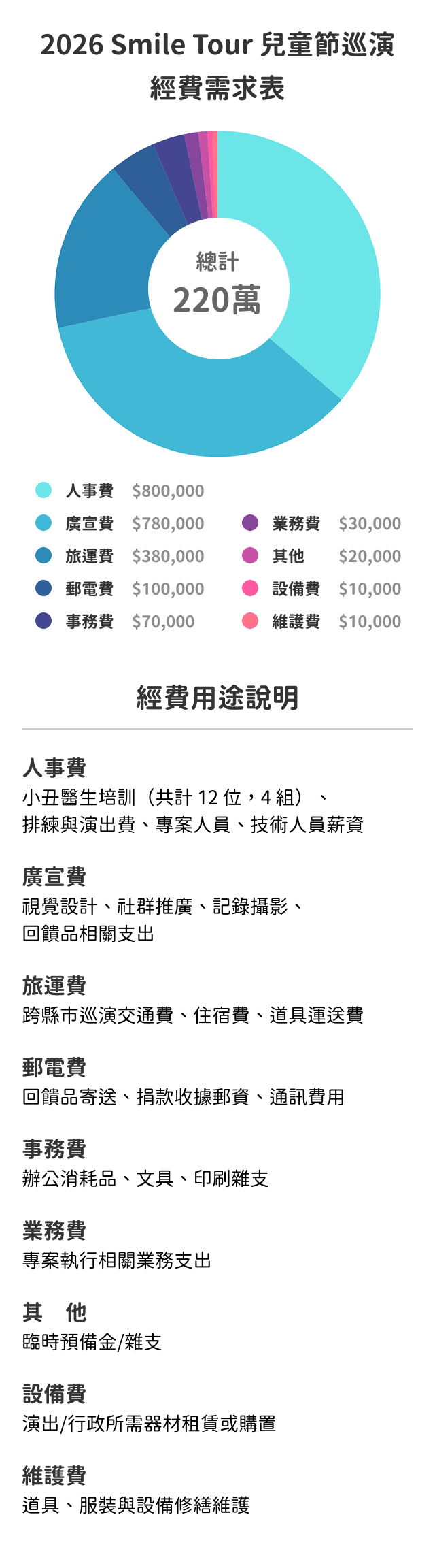 如果您認同我們的公益行動,邀請您支持「2026 Smile Tour 兒童節巡演計畫」,一起成為歡笑傳遞者!