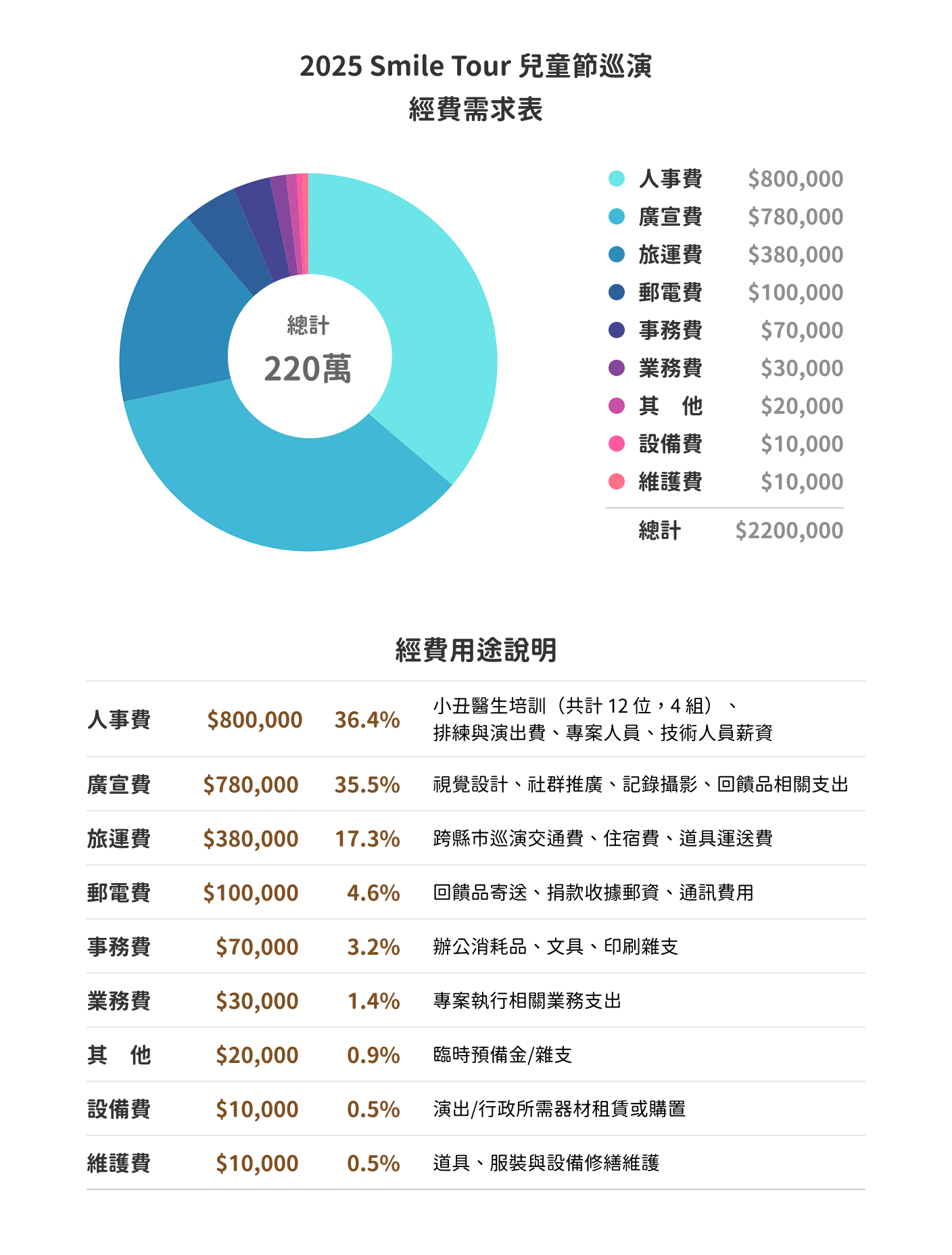 每筆捐款將投入兒童節全台醫院巡演出計畫支出,包含演出服務費、交通差旅、設備租賃、服裝道具、行政管銷等。謝謝您與我們一起成為孩子的守護者!
